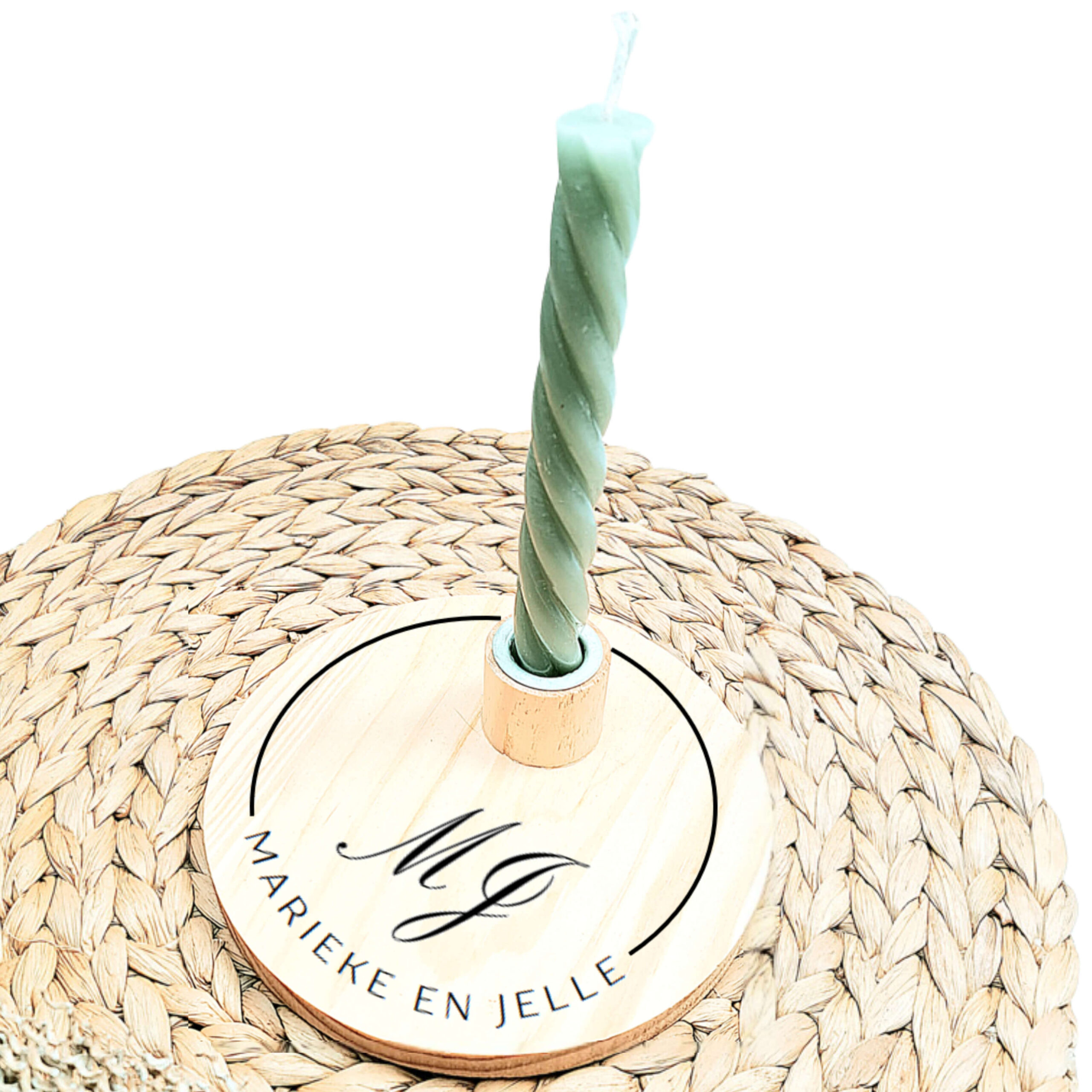Ronde blanco houten kaarsenstandaard met een zwarte opdruk van sierlijk in elkaar overlopende initialen met daaronder de namen en de datum